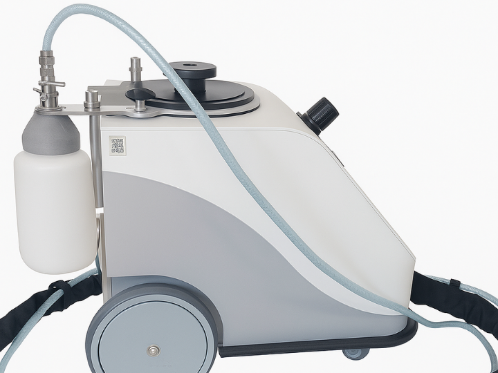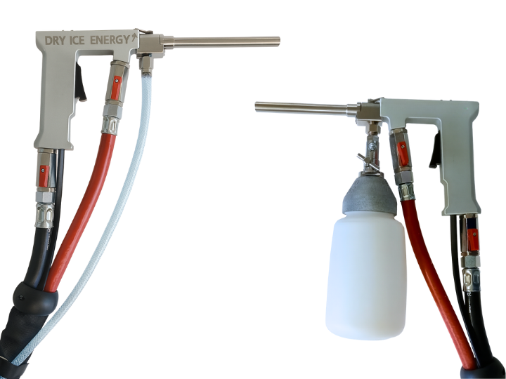 Il materiale abrasivo viene alimentato esternamente e aggiunto al getto di ghiaccio secco tramite il vuoto generato all’ugello. L’installazione richiede solo pochi minuti e può essere eseguita da qualsiasi operatore.